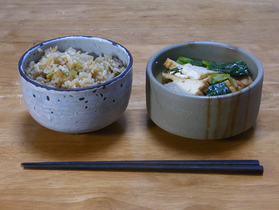 大根葉白胡麻炊き込みご飯/厚揚げ小松菜煮物