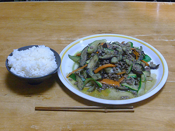 挽肉茄子ズッキーニ人参にんにく炒め
