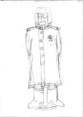 えーと、わるい絵じゃないですよ。よだれ垂らして品がなくて、偉そうな制服と勲章を誇示して権力を振りかざす、聞く耳持たない威圧的な長官像が伝わってきます。多分きみの大人観の投影じゃないかと思いました。線にためらいがあるのが惜しいですね。薄いので画像の加工に手間取りました。もっと自信を持って描いてみてはいかがでしょう。イメージする力はあるのですから、心がけ次第でもっともっと絵に力が宿ると思います。世の中えげつない大人はいっぱいいますけど、ためらわずに視線を向けることも大切ですよ。絵を描くのを好きになることは、生きる力を身に付けることでもあるんじゃないかな、なんて思います。(なかじま)